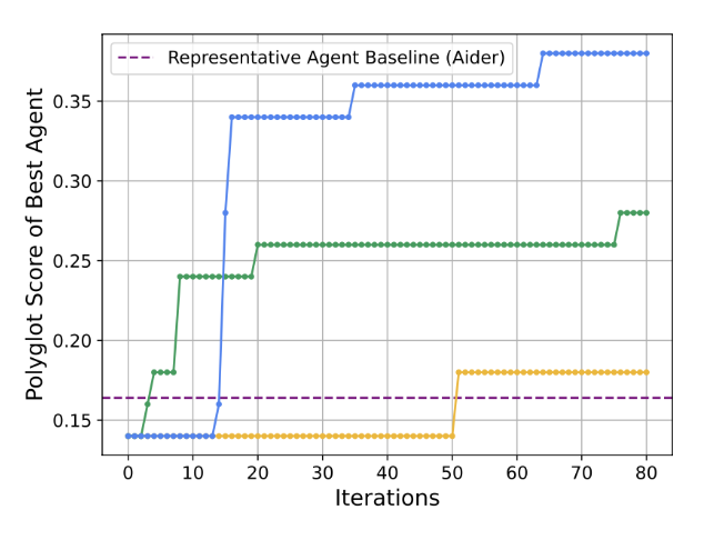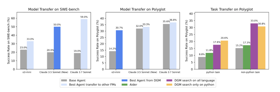 在Polyglot上,DGM的性能从初始的14.2%跃升至30.7%,远超由Aider开发的具有代表性的人工设计智能体。